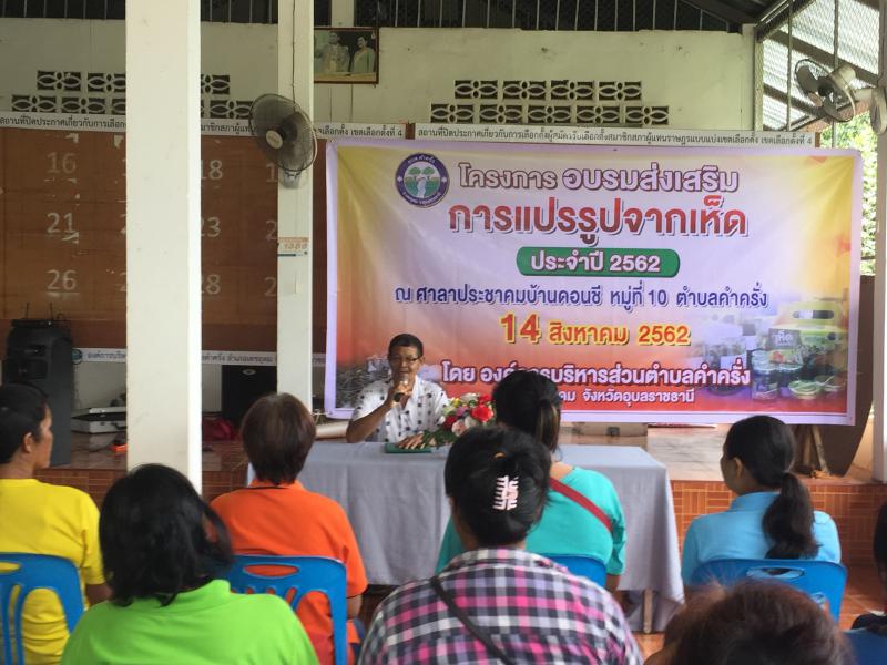 โดยองค์การบริหารส่วนตำบลคำครั่ง ได้ดำเนินโครงการอบรมส่งเสริมการแปรรูปอาหารจากเห็ด ประจำปี 2562 เพื่อการเสริมสร้างทักษะด้านอาชีพให้แก่ประชาชนผู้ที่สนใจ สนับสนุนให้มีการฝึกอบรมในการทำอาชีพเสริม เป็นการใช้เวลาว่าง ให้เป็นประโยชน์ มีคุณค่า สร้างความรักความสามัคคี ลดค่าใช้จ่ายภายในครอบครัว ส่งเสริมการสร้างรายได้ให้กับครอบครัวและชุมชนต่อไป โดยดำเนินการอบรมในวันที่ ๑๔ สิงหาคม พ.ศ. ๒๕๖๒