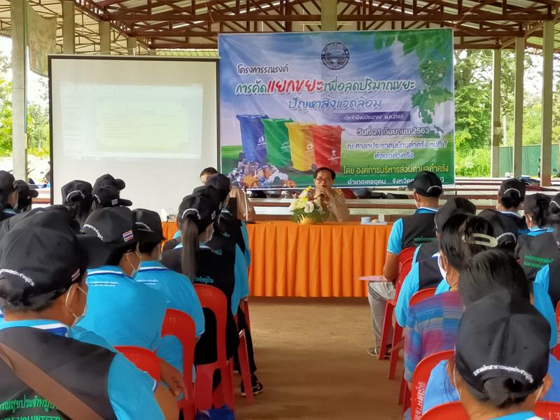 รายละเอียด : ด้วยองค์การบริหารส่วนตำบลคำครั่ง ได้ดำเนินโครงการรณรงค์การคัดแยกขยะเพื่อลดปริมาณขยะปัญหาสิ่งแวดล้อม ประจำปี 2563 ขึ้นเพื่อให้ลดปริมาณขยะมูลฝอยชุมชน รวมถึงประชาชนในชุมชน มีสุขภาพร่างกาย สุขภาพจิตที่ดี และมีสิ่งแวดล้อมที่ดีในหมู่บ้านชุมชน เพื่อมุ่งเน้นป้องกัน แก้ไขปัญหาสิ่งแวดล้อมและลดโลกร้อนในชุมชน และเป็นการพัฒนาที่ยั่งยืนโดยให้ความสมดุลในทุกมิติตามปรัชญาเศรษฐกิจพอเพียง ช่วยกันรณรงค์ทำดีต่อสิ่งแวดล้อมในชุมชนด้วยการร่วมมือกันแยกขยะ ระหว่าง ขยะเปียก แก้ว พลาสติกและขยะที่เป็นพิษ เพื่อสามารถนำไปกำจัดได้อย่างถูกวิธี และสามารถสร้างรายได้ให้กับครอบครัวอีกทางหนึ่งต่อไป โดยดำเนินการอบรมในวันที่ ๒๑ กันยายน พ.ศ. ๒๕๖๓ ณ ศาลาประชาคมบ้านคำครั่ง หมู่ที่ ๗ ตำบลคำครั่ง อำเภอเดชอุดม จังหวัดอุบลราชธานี