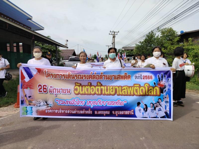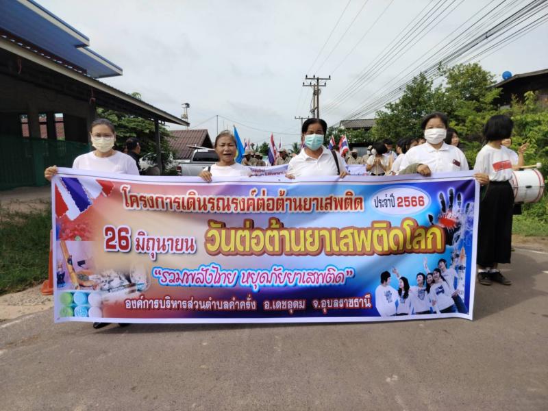 รายละเอียด : นางทัศนีย์ สีดา นายกองค์การบริหารส่วนตำบลคำครั่ง คณะผู้บริหาร หัวหน้าส่วนราชการ พนักงานส่วนตำบล ร่วมกับผู้นำชุมชน รพสต.ตำบลคำครั่ง อสม.ตำบลคำครั่ง คณะครูนักเรียนโรงเรียนบ้านคำครั่ง และ อปพร.ตำบลคำครั่ง เข้าร่วมกิจกรรมเดินรณรงค์ป้องกันและแก้ไขปัญหายาเสพติดประจำปี2566 เนื่องในวันยาเสพติดโลก