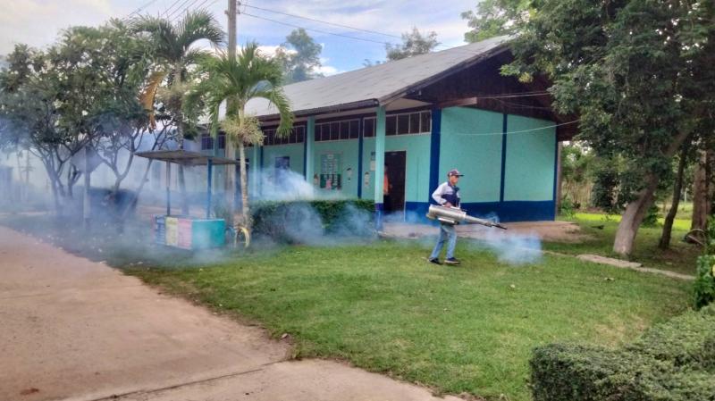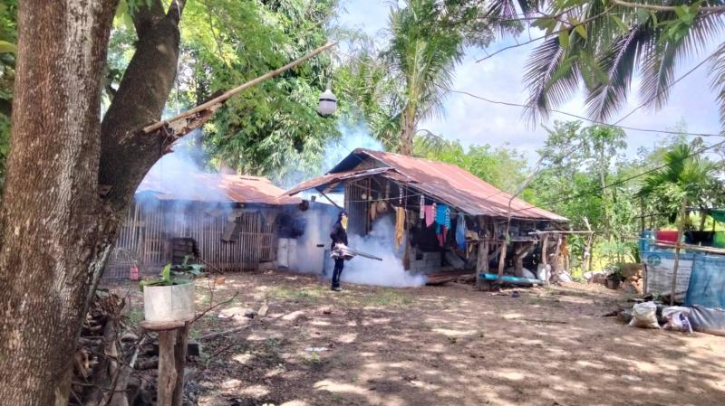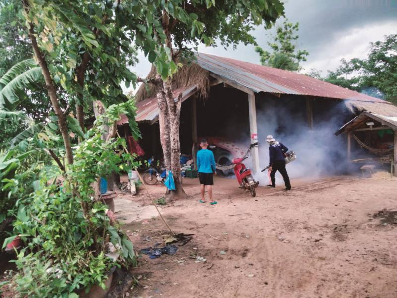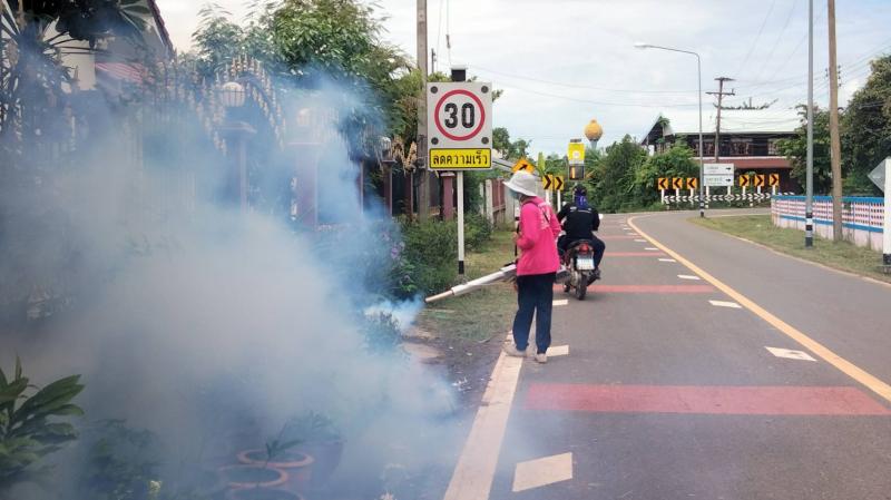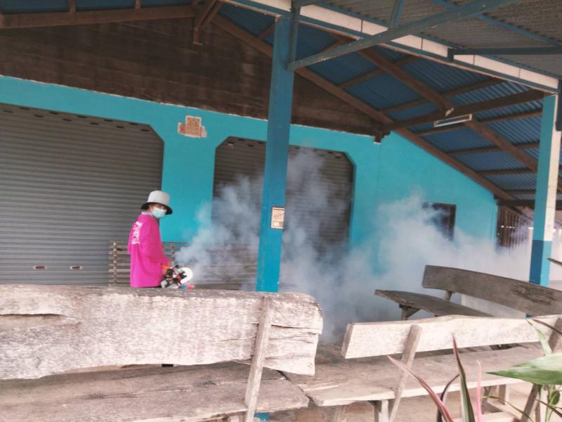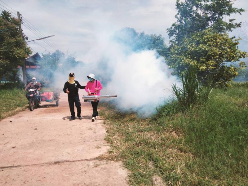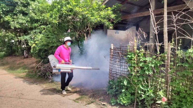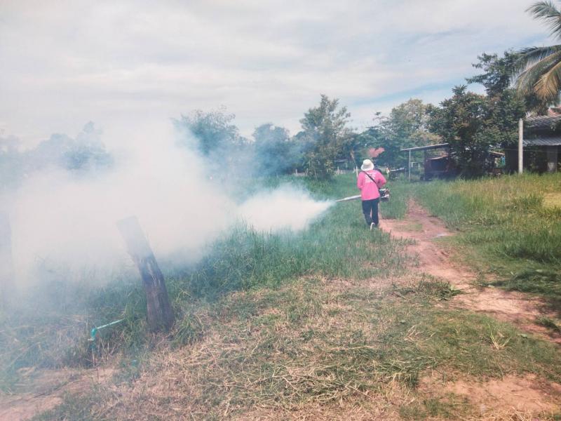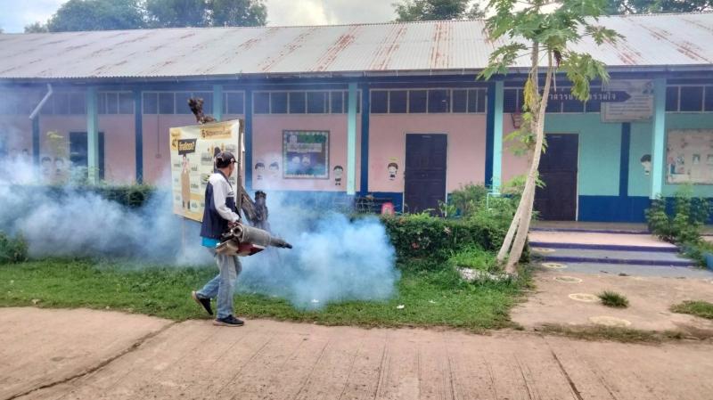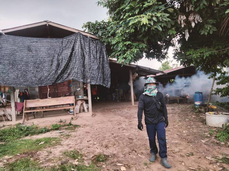 พ่นหมอกควันกำจัดยุงลายตามบ้านเรือนของหมู่ 3 บ้านโนนสว่าง และโรงเรียนบ้านคำครั่ง