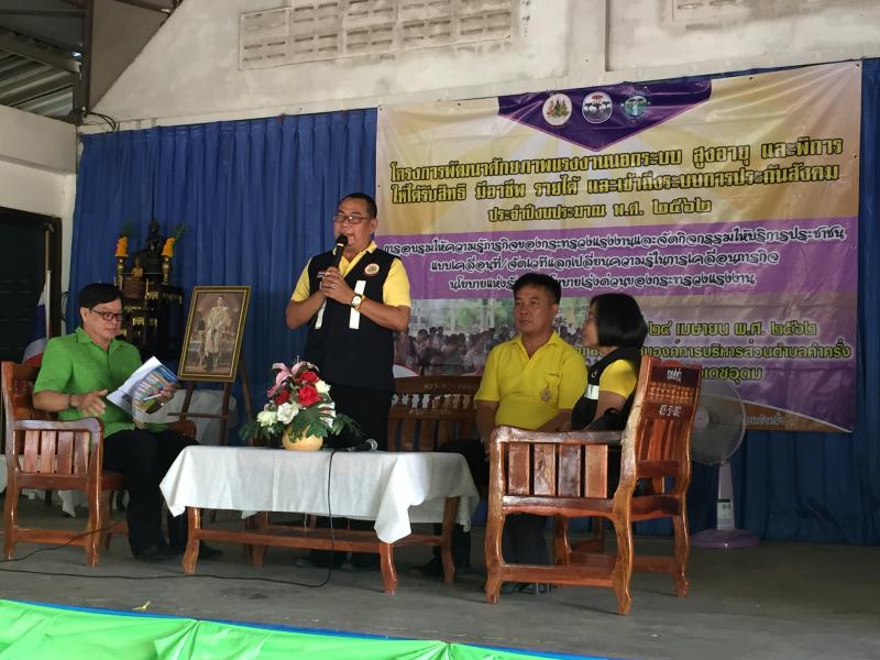 รายละเอียด : โครงการพัฒนาศักยภาพแรงงานนอกระบบสูงอายุและพิการให้ได้รับสิทธิ มีอาชีพ มีรายได้และเข้าถึงระบบการประกันสังคม ประจำปีงบประมาณ พ.ศ. ๒๕๖๒